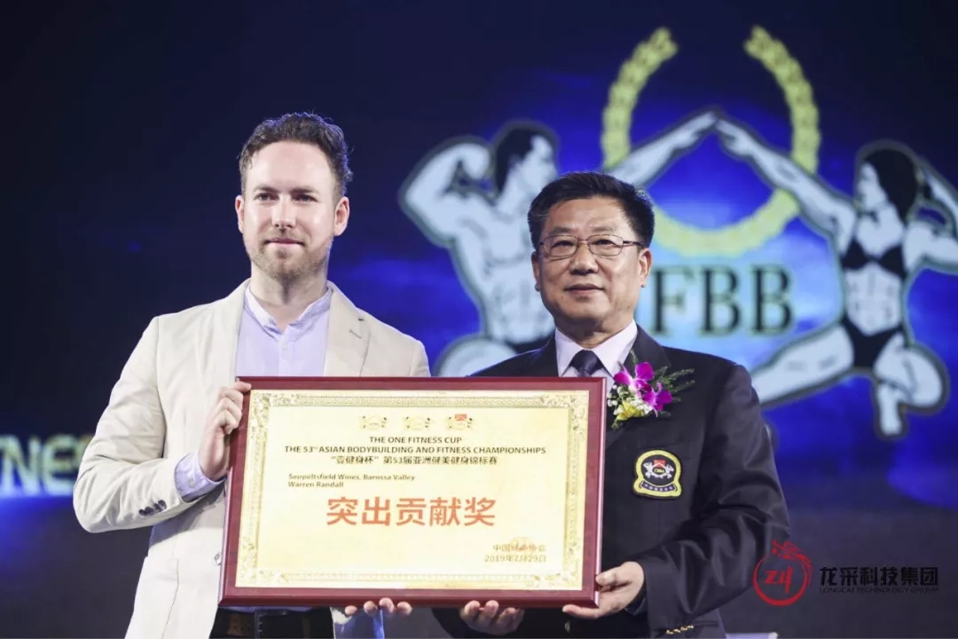 亞洲健身健美聯合會主席、中國健美協會主席張海峰為澳洲沙普酒莊營銷總監Chad Elson頒發突出貢獻獎。